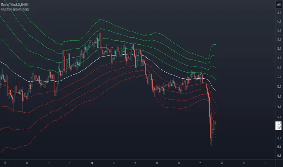 The Silverman Rule of Thumb Bandwidth is a heuristic method used to estimate the optimal bandwidth for kernel density estimation, a statistical technique for estimating the probability density function of a random variable. In the context of financial analysis, such as in this indicator, it helps determine the width of bands around a moving average, providing insights into the level of volatility in the market. This method is particularly useful because it offers a quick and straightforward way to estimate bandwidth without requiring extensive computational resources or complex mathematical calculation