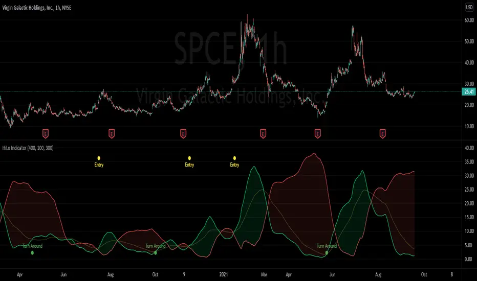 This generates a weaving pattern that shows bullish (lo>hi) and bearish (lo<hi) zones. WMA's (Fast and Long which can be changed and I have the defaults set kind or high) are used to smooth the functions. Only the long is shown for the "hi" function to keep the plot cleaner. I used crossover points of the "lo" WMA curves to specify places of possible bearish "turn around" points and bullish "entry" points. Alerts can set set for these along with the main crossovers where the plots cross bullish (green) and bearish (red). It seems to be a really good companion to popular buy/sell indicators like the Supertrend.