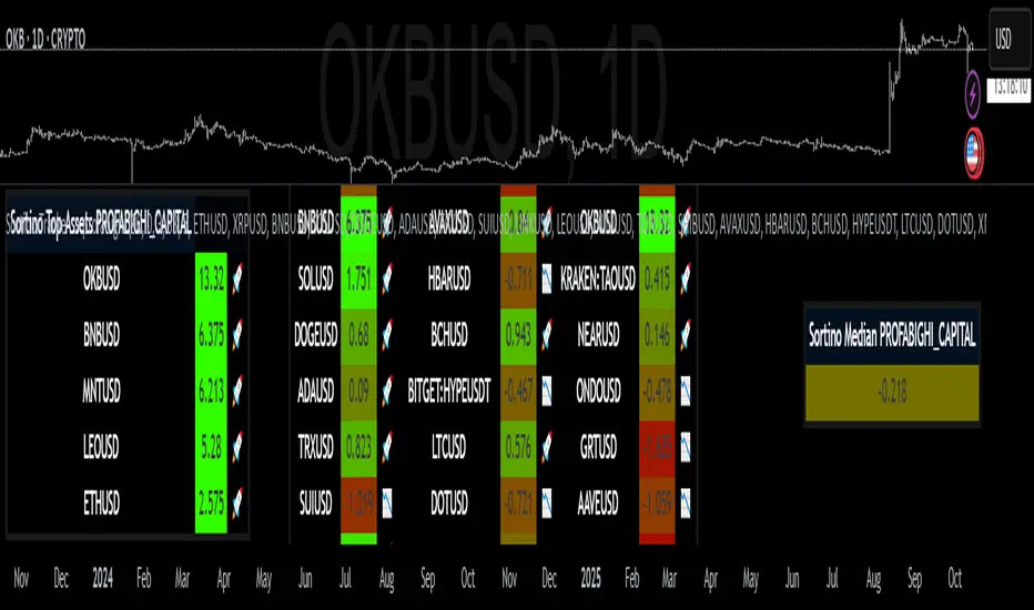 The Sortino Ratio Tracker → PROFABIGHI_CAPITAL indicator assesses downside risk-adjusted performance by computing the Sortino ratio for up to 33 customizable altcoins over a rolling lookback period, focusing solely on negative volatility to penalize harmful deviations while smoothing and annualizing for actionable insights. It dynamically generates color-gradient tables displaying individual Sortinos, median benchmarks, and ranked top performers with emoji indicators, empowering traders to prioritize assets with superior returns relative to their drawdown risks for more resilient portfolio construction.