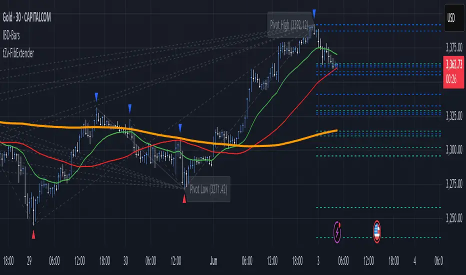 FibExtender [tradeviZion] is an advanced tool that automates Fibonacci extension plotting based on significant pivot points in price movements. Fibonacci extensions are percentages based on prior price swings, often used to forecast potential resistance zones where price might reverse or consolidate. By automatically marking these Fibonacci levels on your chart, FibExtender saves time and reduces the complexity of technical analysis, especially for users unfamiliar with calculating and plotting these levels manually.