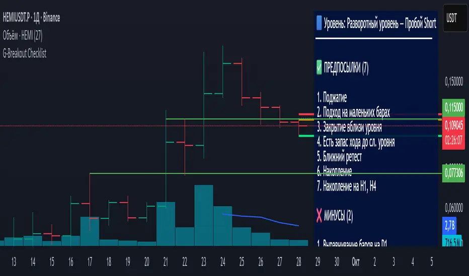 ## Чек-лист уровней (Пробой) — ATR (классический показывается, Активный = медианный 5-дневный или Ручной), фиксация D1, расчёт позиции от риска