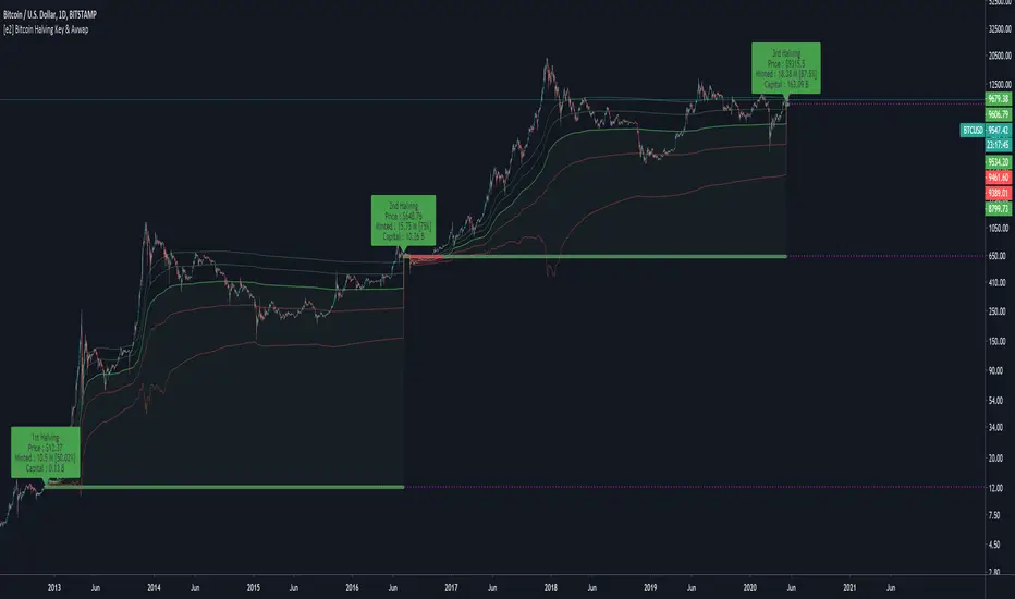 This indicator shows a Key Level Support & Resistance level and VWAP that reset on your choice of the Bitcoin's halving date.