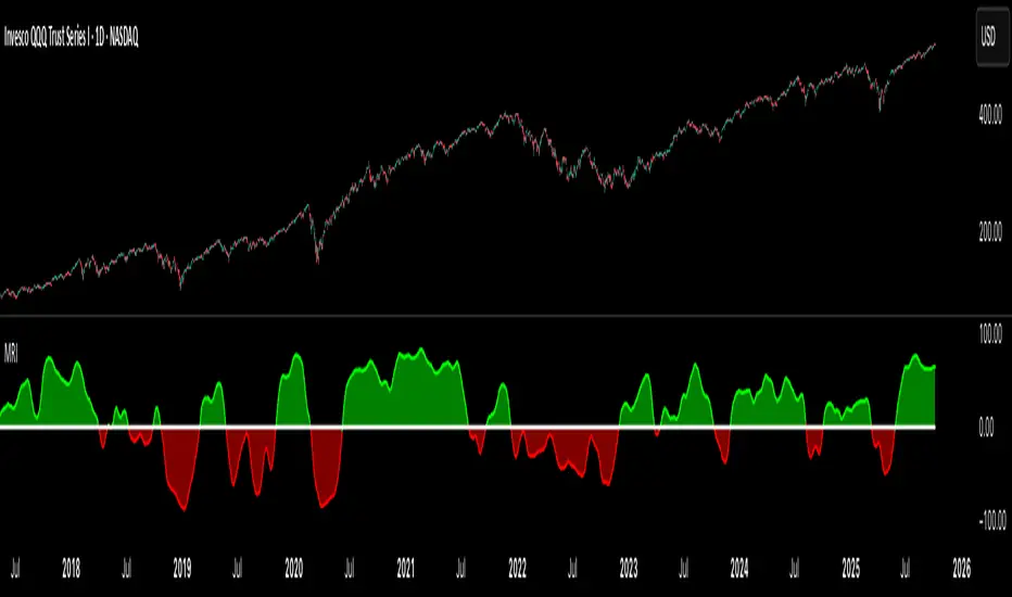 All assets are directionally aligned with their historical correlation to the S&P 500. Each asset contributes equally based on its individual bullish or bearish signal. The overall market regime is calculated as the difference between the number of Risk-On and Risk-Off signals divided by the total number of assets, displayed as the percentage of markets confirming each regime. Green indicates Risk-On and occurs when the number of Risk-On signals exceeds Risk-Off signals, while red indicates Risk-Off and occurs when the number of Risk-Off signals exceeds Risk-On signals.
