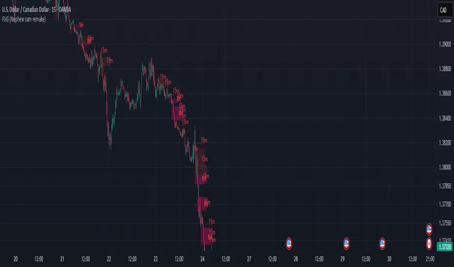 Hello i am making my own FVG script inspired by Nephew Sam as his fvg code is not open source. My goal is to replicate his Script and then add in alerts and more functions. Thus, i spent few days trying to code. There is bugs such as lower time frame not showing higher time frame FVG.