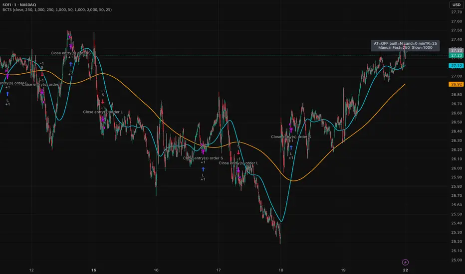 This strategy trades price trend flips using two Butterworth low-pass filters (a FAST filter and a SLOW filter). A trade is taken when the FAST filter crosses the SLOW filter. Optionally, the script can auto-tune the filter lengths by simulating many Fast/Slow combinations and selecting the pair with the best Profit Factor (PF).