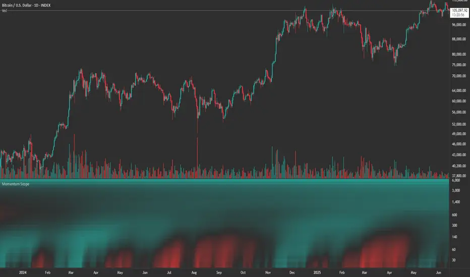 Momentum Scope is a Pine Script™ v6 study that renders a –1 to +1 momentum heatmap across up to 32 lookback periods in its own pane. Using an Augmented Relative Momentum Index (ARMI) and color shading, it highlights where momentum strengthens, weakens, or stays flat over time—across any asset and timeframe.