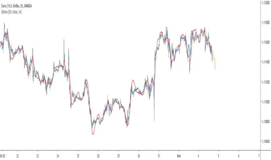 A qlsma, unlike the classic lsma, will fit better to the price and will be more reactive, this is the advantage of using an higher degrees for its calculation, we can model more complex relationship.