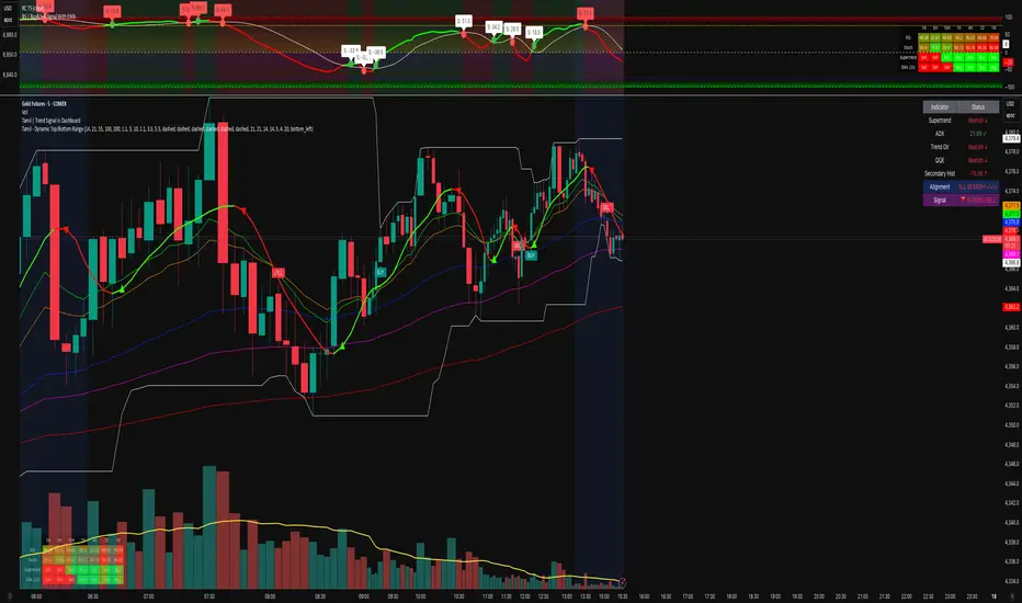 Tamil – Dynamic Top/Bottom Range with EMA is an all-in-one trend + targets indicator designed for intraday and swing trading. It combines a clean EMA crossover entry signal, automatic take-profit levels, dynamic support/resistance range lines, and a multi-timeframe dashboard to quickly confirm trend strength across multiple timeframes.