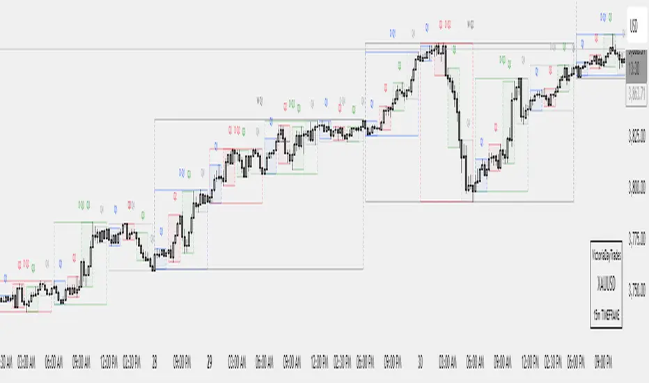 Built for Quarterly Theory. This indicator maps repeating quarters across three rhythms—90-minute, Daily, and Weekly (18:00 NY → 18:00 NY)—so you can track where price is within the current quarter and how it reacts to the previous quarter’s high/low.