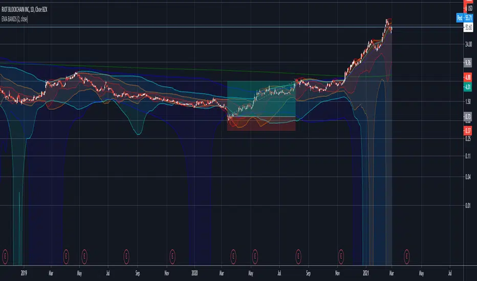 //The green line gives a simple average of the last 1618 candles. The further price action is from the mean, the more the price will be pulled back. (Ideally)