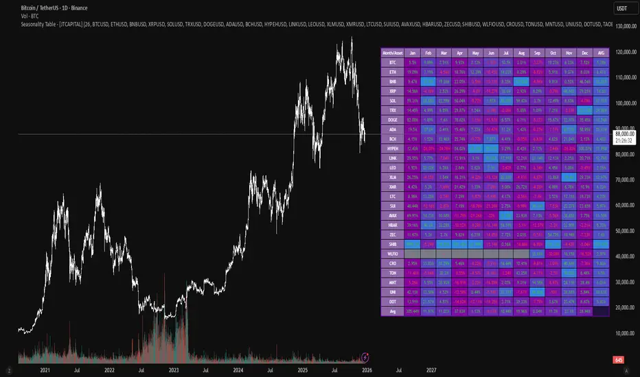 Seasonality Table - [JTCAPITAL] is a modified way to use monthly return aggregation across multiple assets to identify seasonal trends in cryptocurrencies and indices.