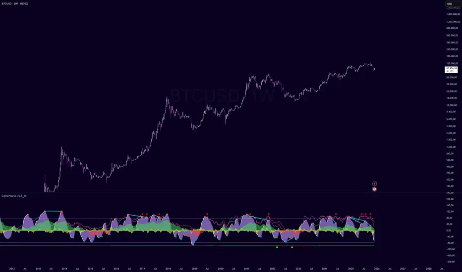 The WaveTrend core is the heart of CipherWave. Two WT waves oscillate around the zero line and visualize trend strength, pullbacks and exhaustion.