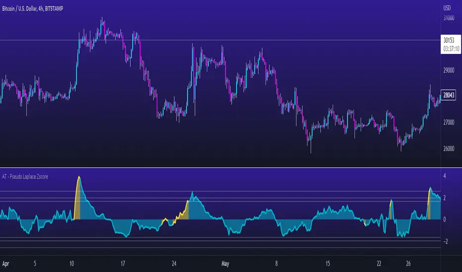 The newest indicator from the Alpha Trading stable is the “Pseudo Laplace Z Score” which combines the established statistical method of z score applied on asset data. Which is based on our previous indicator called the “Alpha Trading – RMS-Z score”. We have made some optimizations, to give an even better fit to the specific returns of price. Optimizations are on the observation that returns are more Laplace distributed than Normal distributed.