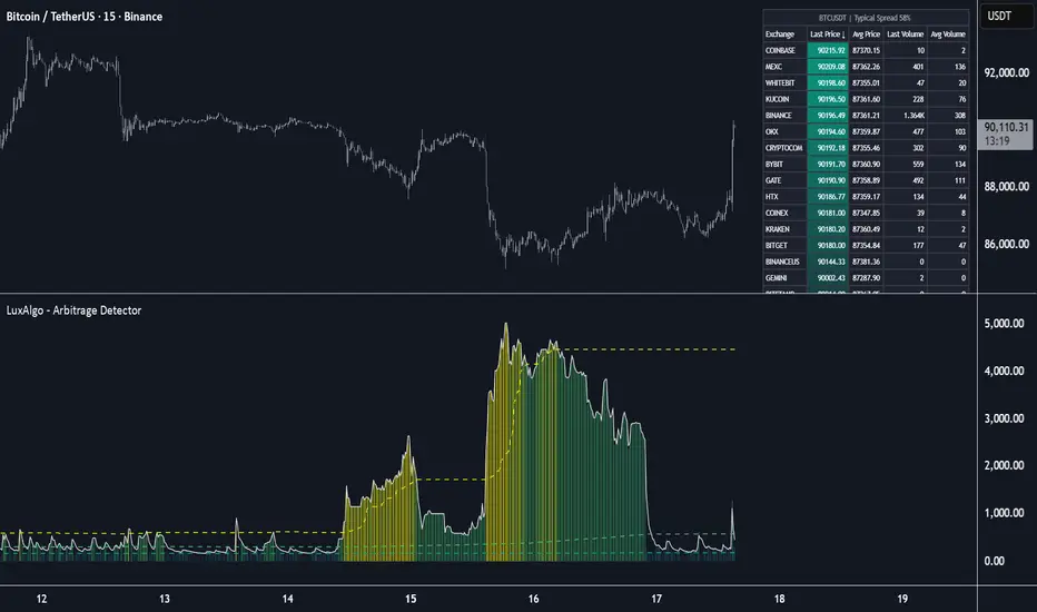 This highly customizable tool features automatic source selection (crypto or forex) based on the asset in the chart, as well as current and historical spread detection. It also features a dashboard with sortable columns and a historical histogram with percentiles and different smoothing options.