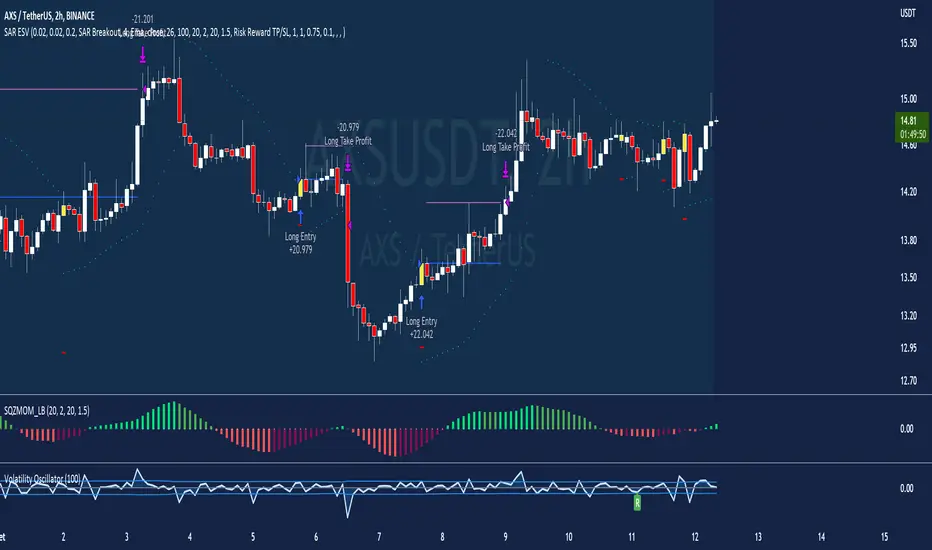 Ele usa o SAR PARABÓLICO como indicador de sinal de entrada, você também pode combinar 3 indicadores para filtrar as entradas: Média Móvel, Squeeze Momentum [Lazy Bear] e Volatility Oscilator [veryfid].