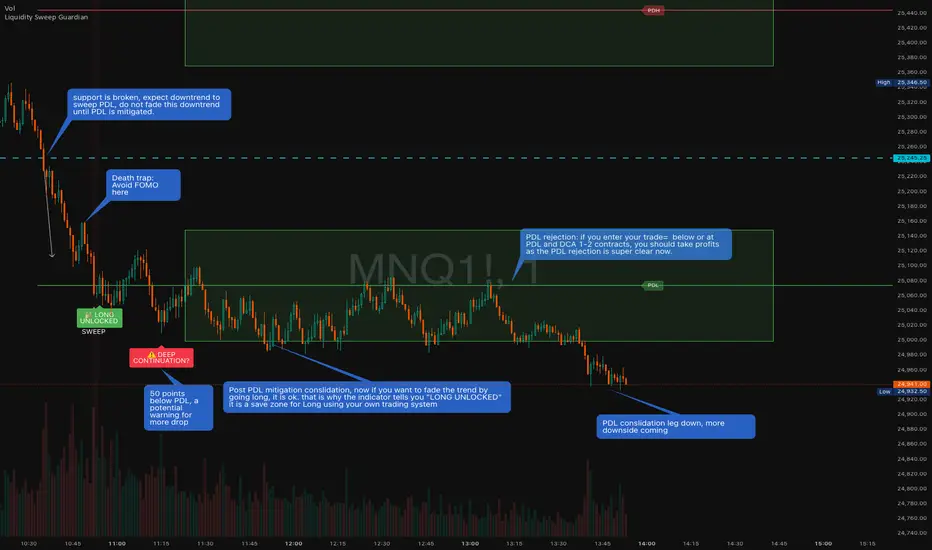 A visual warning system that helps traders avoid premature counter-trend entries near key liquidity levels (Previous Day High/Low). The indicator displays danger zones centered on PDH/PDL and tracks when these levels have been swept and reclaimed.