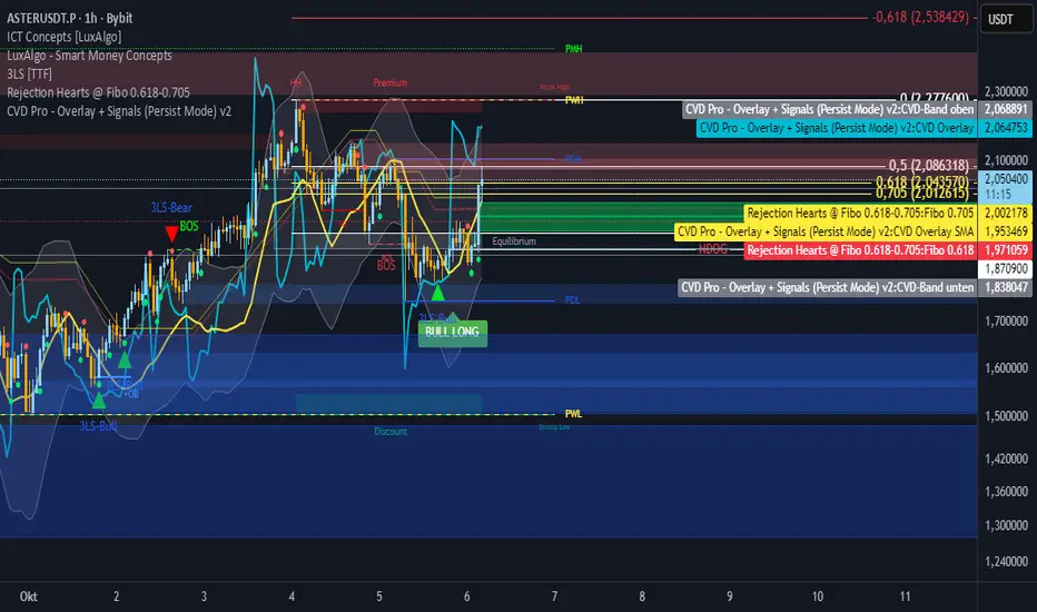 A strong CVD divergence near a key FVG or 0.5–0.705 Fibonacci zone often signals reversal.