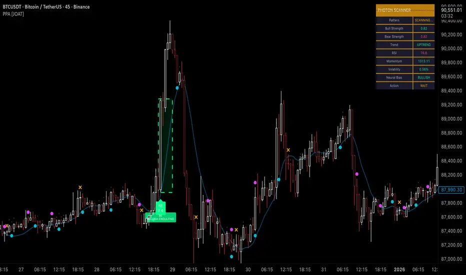 Photon Price Action Scanner is an open-source overlay indicator that automates the detection of 15+ candlestick patterns while filtering them through multiple confirmation layers. The core problem this indicator solves is pattern noise: raw candlestick pattern detection produces too many signals, most of which fail because they lack context. This indicator addresses that by combining pattern recognition with trend alignment, volume-weighted strength scoring, velocity confirmation, and an adaptive neural bias filter.
