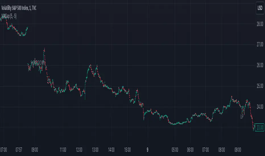 This simple script generates alerts based on the difference between the previous trading day's VIX close and the current trading day's opening bar. It is designed for use on the TVC version of the VIX chart, with 1-minute bars.