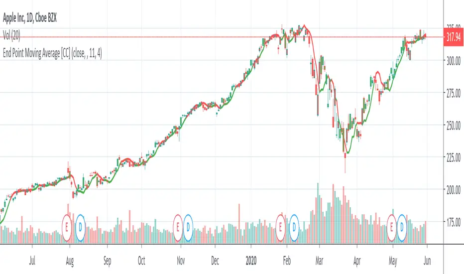The End Point Moving Average was created by Patrick E. Lafferty (Stocks & Commodities V13 (413-417)) and it is essentially a variation of the weighted moving average but the weight system is different. Feel free to change the offset and length amounts to adjust to your needs but I'm using the default amounts in my script. This hugs the price very closely and I think you will enjoy this script as much as I had making it. As always buy when the indicator line is green and sell when it is red!