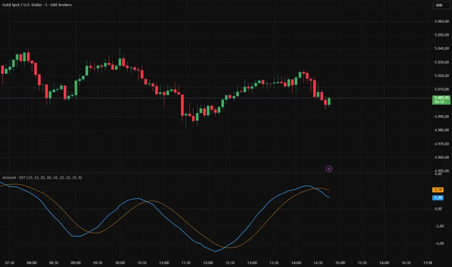stelaraX – Know Sure Thing (KST) is a composite momentum indicator designed to measure long-term trend momentum by combining multiple rate-of-change components. It integrates short-, medium-, and long-term momentum into a single oscillator, providing a broad view of market strength and direction.