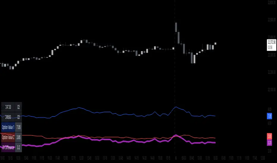 This indicator calculates and visualizes the difference between two option contracts (either their time value or option value) based on a user-selected underlying instrument (e.g., NIFTY 50). It fetches real-time data for the underlying and the two specified options, computes their intrinsic and time values, and plots either the time value or option value (ask price) along with their difference. A customizable table displays key details, including strike prices, option types (Call/Put), and the selected values, with a dark mode option for better visibility.
