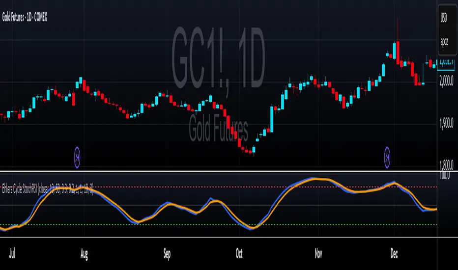 The Ehlers Enhanced Cycle Stochastic RSI is a momentum oscillator that automatically adjusts its lookback periods based on the dominant market cycle. Unlike traditional Stochastic RSI which uses fixed periods, this indicator detects the current cycle length and scales its calculations—making it responsive in fast markets and stable in slow ones.