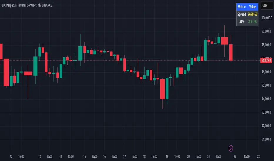 This script is an essential tool for traders looking to exploit price discrepancies between the BTC spot market and futures market through a cash-and-carry arbitrage strategy. It provides real-time data on spreads, annualized returns (APY), and visual alerts, helping traders make informed decisions and maximize their profit potential.