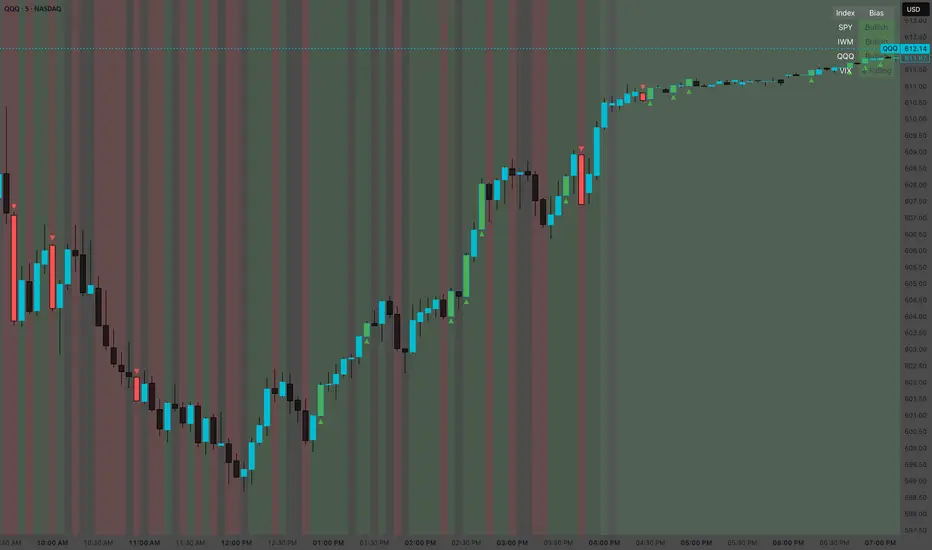 This refined toolkit synchronizes the S&P 500 (SPY), Russell 2000 (IWM), and Nasdaq 100 (QQQ) with VIX dynamics to pinpoint when institutional capital is flowing into or out of risk assets. It’s especially effective for traders who want to align their intraday bias, trade direction, or exposure with real-time market tone.