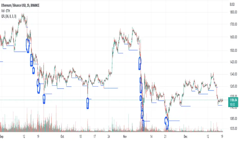 This QFL base scanner instead looks for the lowest low in a given period and marks it as a base. The longer the period of the lowest low, the more significant the bases will be. Buys are marked when the price has bounced x% above the base and then fallen y% below the base. This approach seems to give more predictable (and tradable) results.