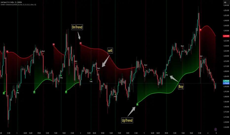 The provided script is a complex, two-part Pine Script indicator designed for use on TradingView. It combines two main strategies: the Emitter [CLEVER] module for generating trading signals using an oscillator, and the Extensive [CLEVER] module for identifying trend direction and potential liquidity zones using a variation of the Variable Index Dynamic Average .