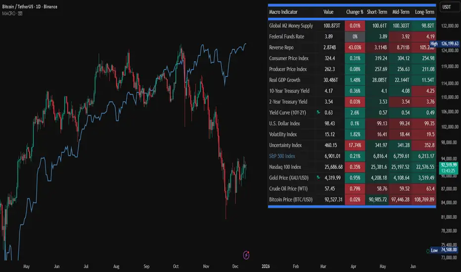 The script provides a macro dashboard that tracks changes across key economic dimensions: monetary policy, inflation and growth, bond markets, and risk indicators. With built-in anomaly detection and trend analysis across short-, mid-, and long-term timeframes, it helps interpret market moves through a macroeconomic lens, whether analyzing equities, commodities, or digital assets.
