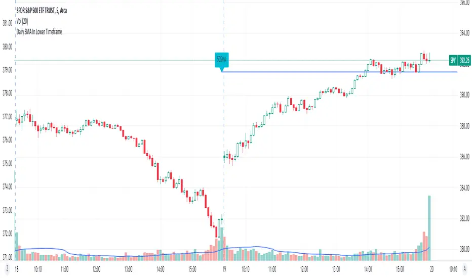 This script aims to provide the daily SMAs (50,100,200) in lower time frames, but ONLY if current price is less than 5% away from it (public code version)