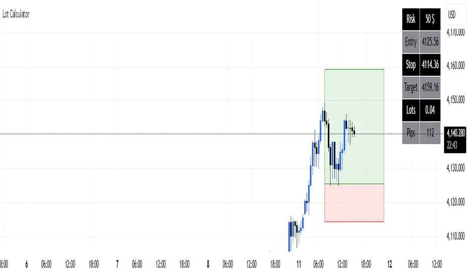 Lot Size Calculator for GoldThis indicator is designed exclusively for the XAUUSD symbol and will not activate on any other instrument.