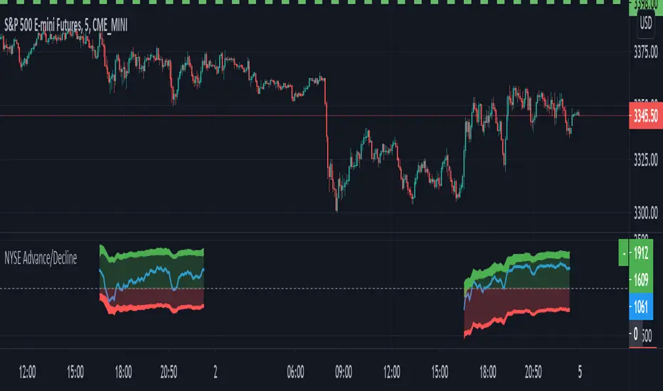 An indicator for traders who trade intraday on the US market. It makes use of the symbols made available by TradingView to show the number of advancing vs declining stocks.