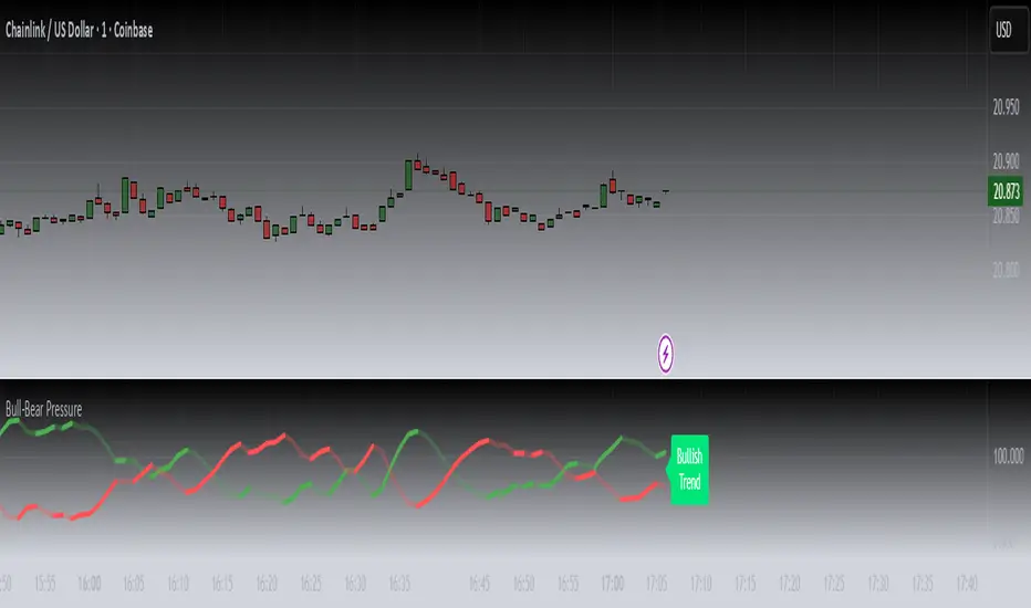 Bull-Bear Pressure measures the live tug-of-war between bullish and bearish momentum by transforming internal engine data into a visual gauge of market pressure.
