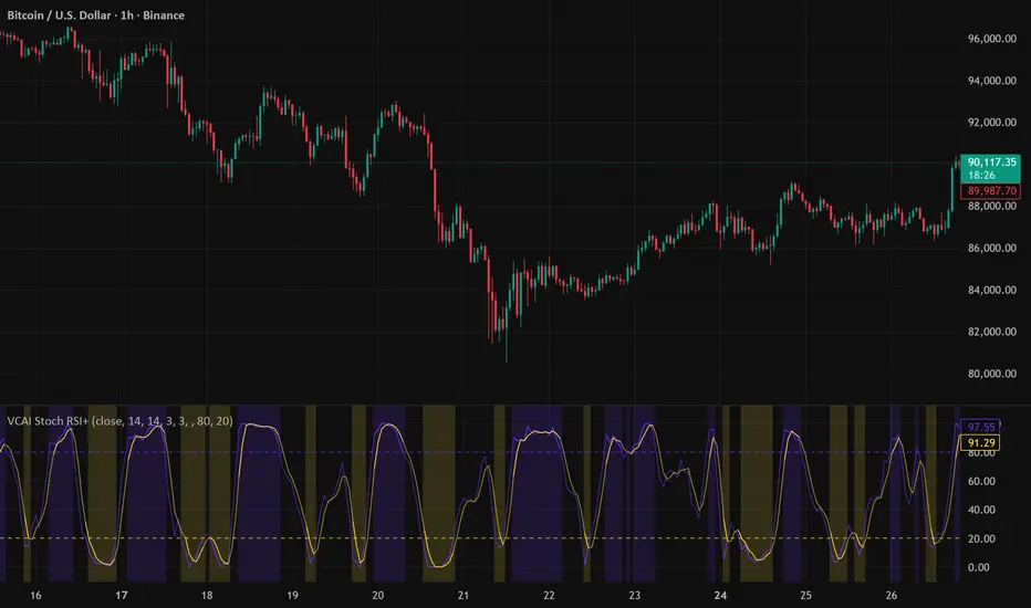 VCAI Stoch RSI+ is a cleaned-up Stochastic RSI built with V-Core colours for faster, clearer momentum reads and more reliable OB/OS signals.