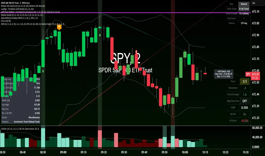 Choose OR (catch either condition) or AND (only the biggest, cleanest spikes). Spikes get a separate highlight layer (same bar, brighter color) plus an optional background tint. There’s also a Volume MA with three modes (Neutral Gray, Purple, or Slope-Aware that shifts mint/pink based on MA slope).