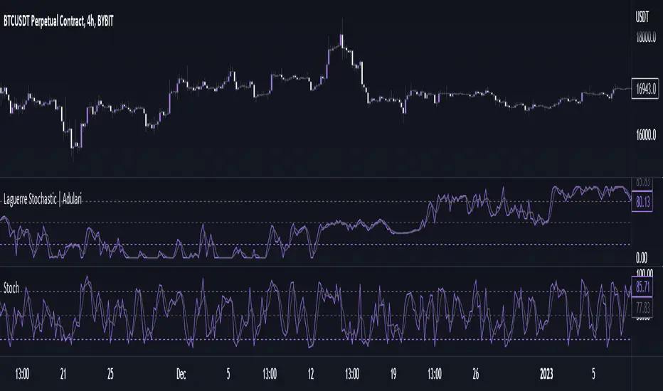 The Laguerre Stochastic is similar to a 4-period regular Stochastic, except that a Laguerre transform has been applied for price smoothing. The Laguerre transform is a mathematical technique that allows smooth indicators to be built using small amounts of data.