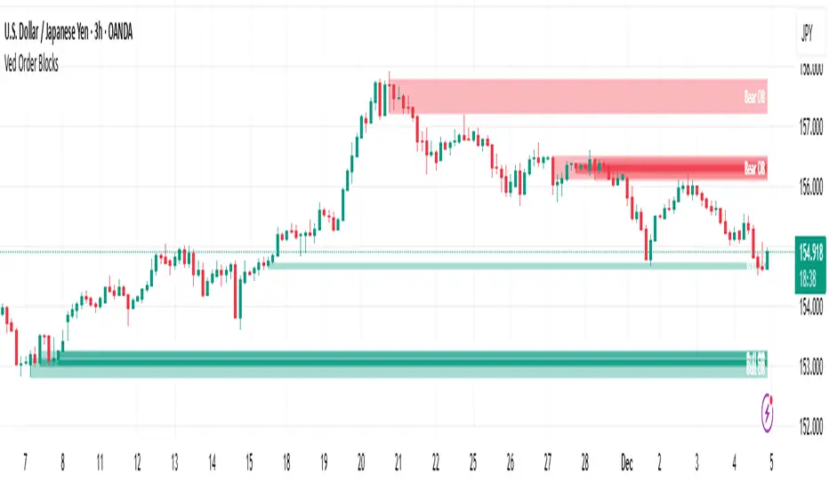 Ved Order Blocks identifies critical supply and demand zones where significant buying and selling pressure exists.