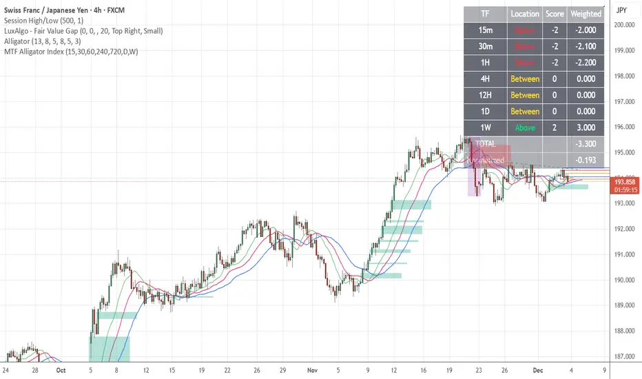 This index just summarizes the locaton of the price in relation to the alligator indicator in different timeframes, to faciliate bias formation.