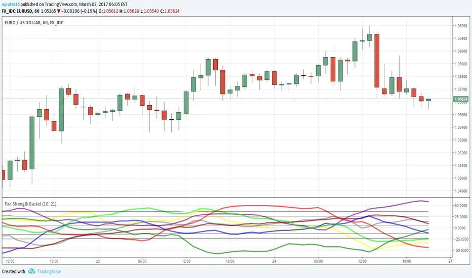 Again thanks to LazyBear for bringing over the wavetrend indicator and glaz for the idea of the basket of currencies. This is a power index based on the wavetrend indicator, I cut it down to 5 securities per currency since the limit of securities I could call was 40. I like to use to see which pair is the most OB/OS as it likely presents the best profit potential.