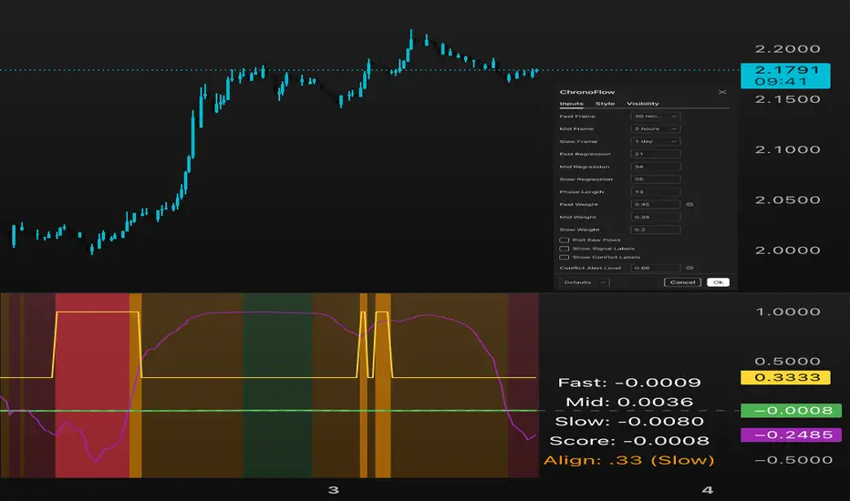 ChronoFlow Sentinel is a regime console that blends normalized fast/mid/slow regression slopes, phases them against a dual-speed EMA spread, and grades alignment so you instantly know whether the time stack is trending, rotating, or fighting itself.