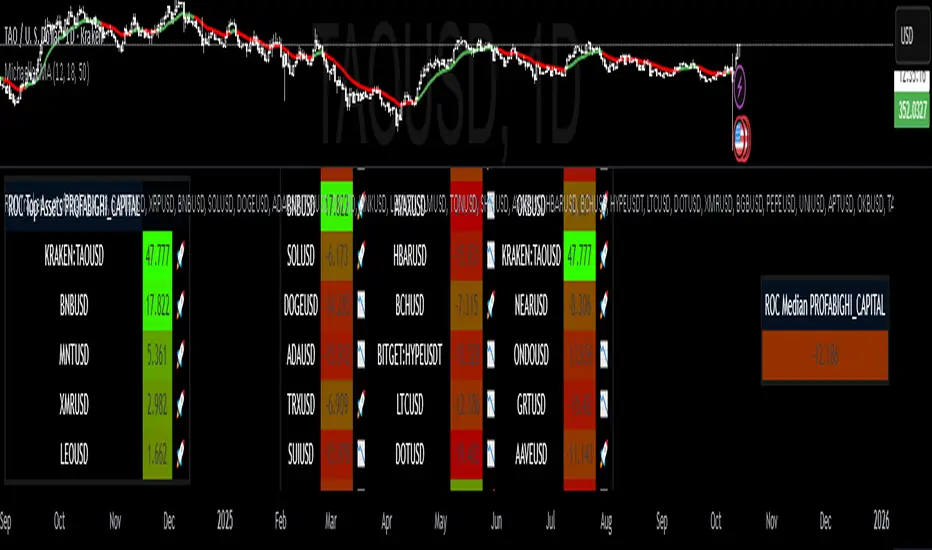 The ROC Tracker → PROFABIGHI_CAPITAL indicator measures momentum strength by calculating the Rate of Change (ROC) for up to 33 customizable altcoins over a user-specified period, revealing acceleration or deceleration in price movements. It dynamically generates color-gradient tables displaying individual ROC values, median benchmarks, and ranked top momentum performers with emoji indicators, allowing traders to spot surging assets for timely entries or fading ones for exits in volatile markets.