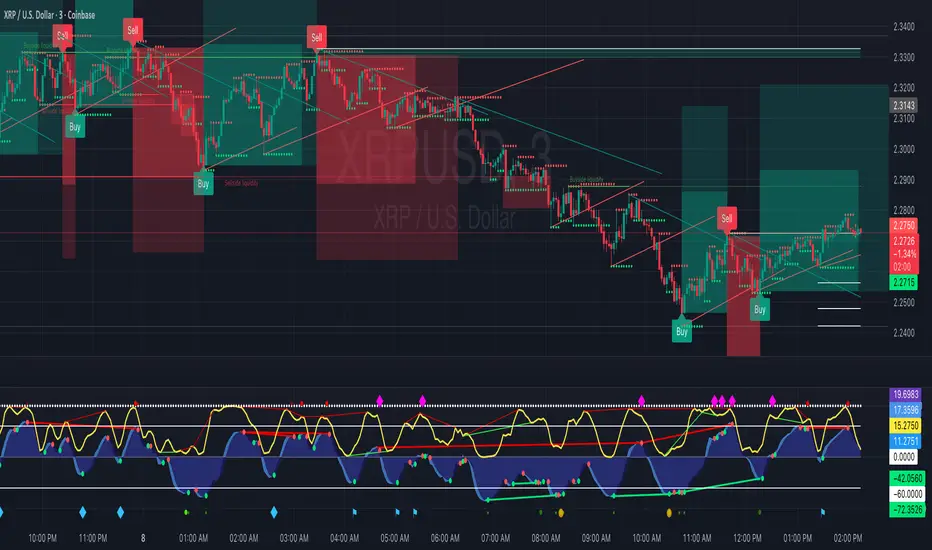 General Strategy Tips Across TimeframesMulti-Timeframe Approach (Highly Recommended): Identify key order blocks on a higher timeframe (e.g., H4 or D1 for structure) and switch to a lower timeframe (e.g., M15 or H1) for precise entries on signals. This filters noise and aligns with smart money concepts—refine broad zones by checking for breaks of structure or fair value gaps on the lower TF. The indicator isn't inherently multi-timeframe (MTF), but it can be applied manually across charts or modified to incorporate MTF data if needed.