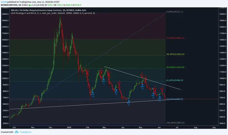 Strategy based on a modified RSI and VI indicators. Best Results with heikin ashi representation.
