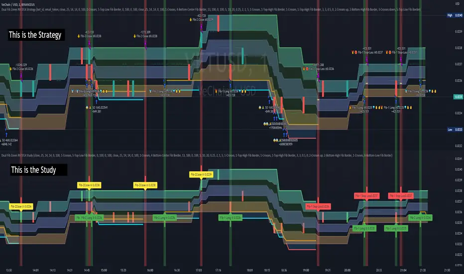 This signal script (aka Study) was created so it could be used with the corresponding strategy "Dual Fibonacci Zone & Ranged Vol DCA Strategy - R3c0nTrader" to create the buy and sell signals for 3Commas bots.