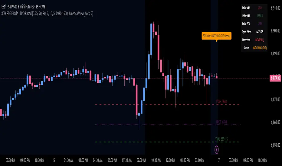 The 80% Edge Rule is a high-probability Market Profile concept that identifies when price is likely to traverse the prior session's Value Area. This indicator automates the detection, confirmation, and tracking of 80% EDGE Rule setups using true TPO (Time Price Opportunity) calculations—not volume profile.