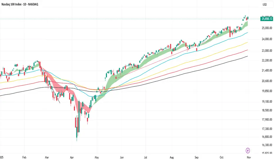 The indicator combines multiple EMA lines (50/100/150/200) with a short- and medium-term EMA cloud. This cloud visually shows whether the market is in a bullish or bearish trend through color changes.