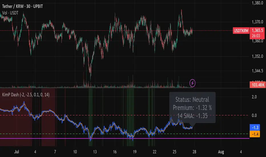 This indicator is an all-in-one dashboard that tracks the real-time price difference of USDT (Tether) between a Korean exchange (Upbit) and a global exchange (Coinbase). This difference is commonly known as the "Kimchi Premium" (Kimp) or "Reverse Premium."